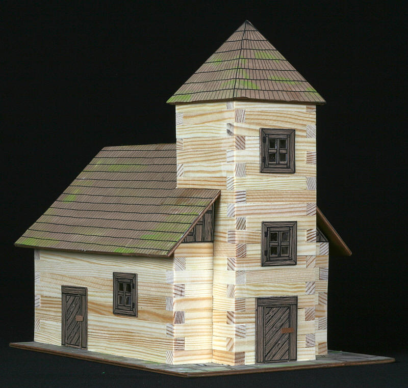Komplet vsebuje material in dele, ki so potrebni za gradnjo cerkve: lesene dele različnih dolžin in debelino 9×9 mm, sestavne dele za izgradnjo strehe, oken, vrat, podlage iz vezanega lesa, folijo za steklo na oknih in druge komponente, ki jih potrebujemo za izgradnjo konstrukcije. Prah, ki je priložen, je namenjen simboliziranju trave, smirkov papir pa za manjše popravke. Prav tako je priložen podroben načrt gradnje.