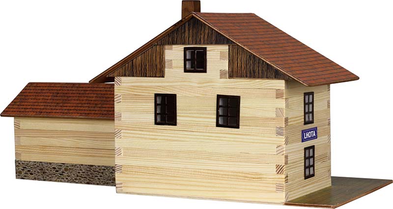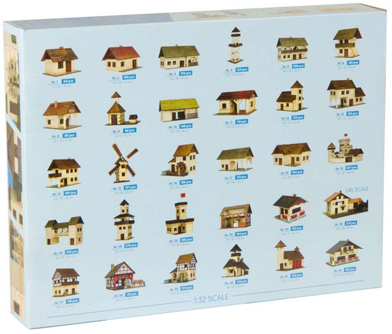 Komplet vsebuje material in dele, ki so potrebni za gradnjo: lesene dele različnih dolžin in debelino 9×9 mm, sestavne dele za izgradnjo strehe, oken, vrat, podlage iz vezanega lesa, folijo za steklo na oknih in druge komponente, ki jih potrebujemo za izgradnjo konstrukcije. Prah, ki je priložen, je namenjen simboliziranju trave, smirkov papir pa za manjše popravke. Prav tako je priložen podroben načrt gradnje.