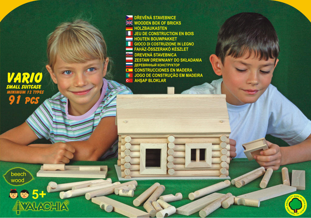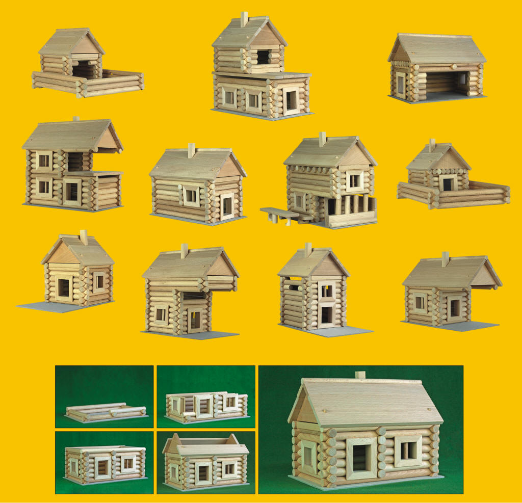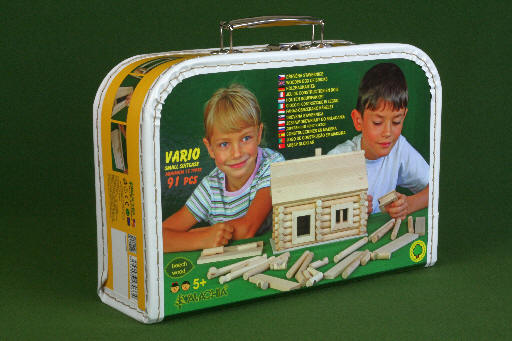 Set vsebuje lesene hlode iz bukovega lesa različnih dolžin, ki v premeru merijo 15 mm. S pomočjo zapornic na koncu vsakega dela se lahko glede na svoje ideje (ali po načrtih, ki so priloženi) sestavljajo različne lesene konstrukcije. Okna in vrata so prav tako iz bukovega lesa. Vsi deli so zapakirani v kovček, ki omogoča enostavno prenosljivost in dolgo življenjsko dobo seta.