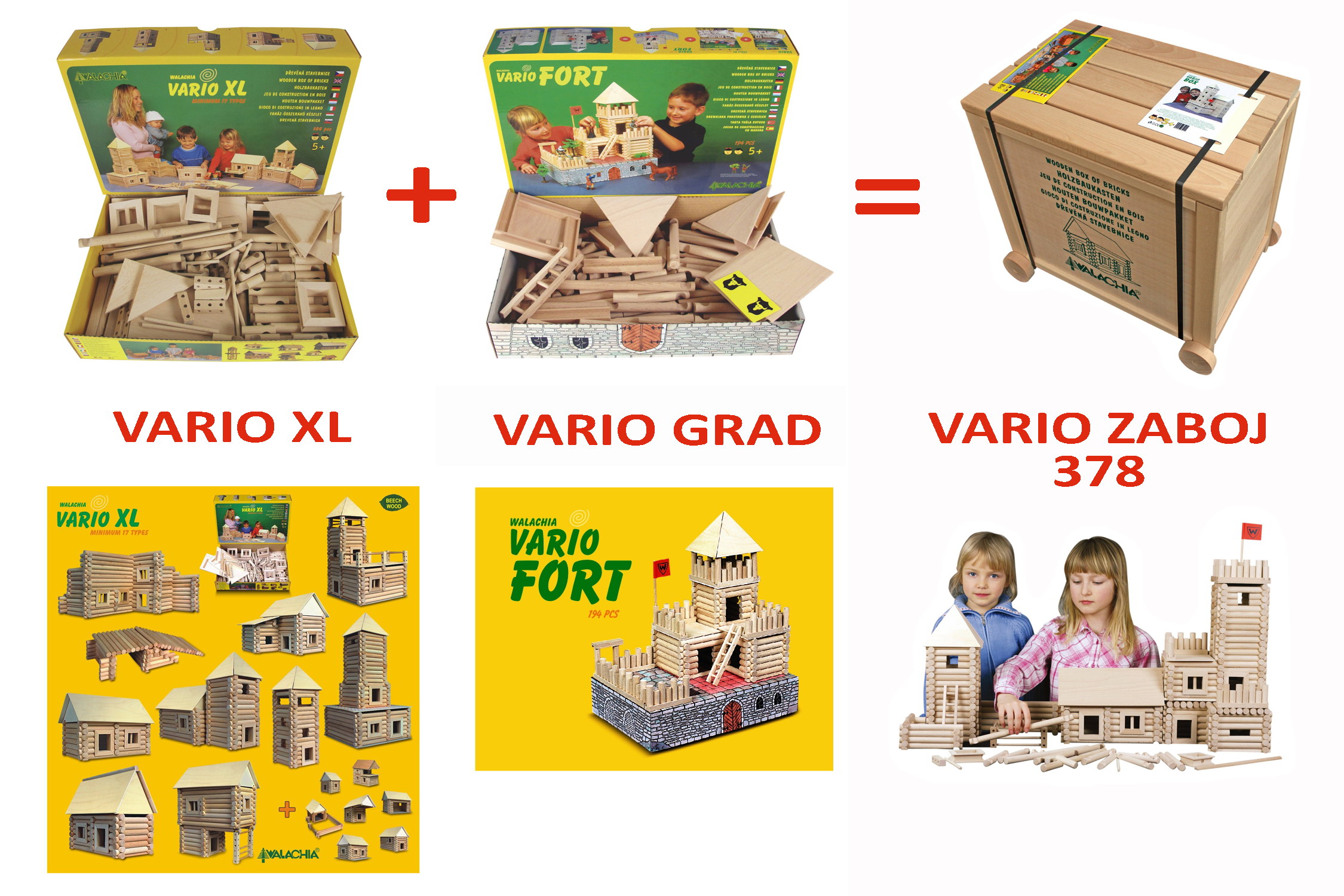 VARIO ZABOJ 378 vsebuje vse, kar vsebujeta kompleta VARIO XL in VARIO GRAD. Iz 378 lesenih delov, ki so skranjeni v kakovostni leseni škatli, je mogoče sestaviti najmanj 17 vrst različnih lesenih konstrukcij in veliki grad.