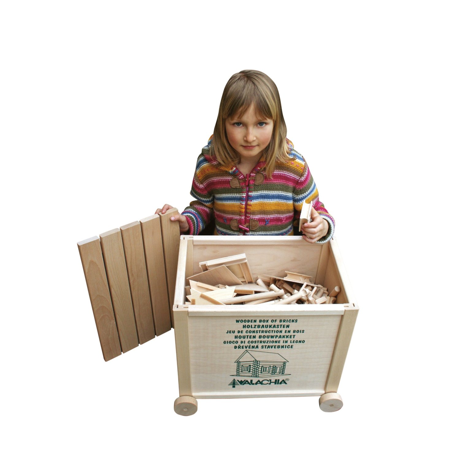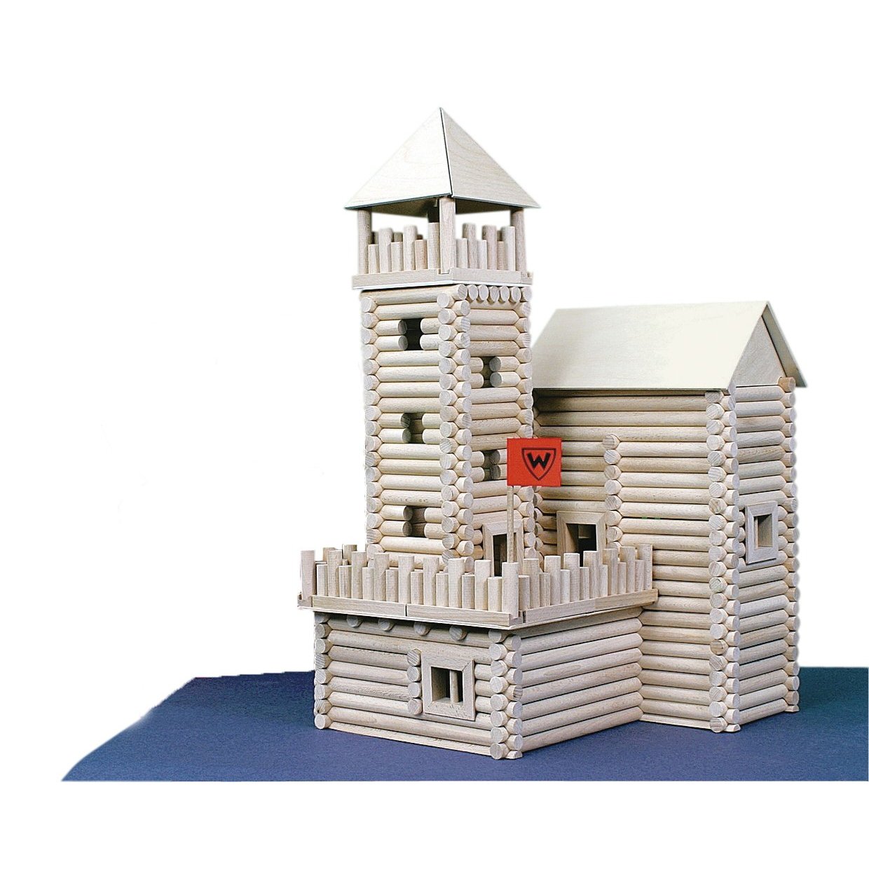 Set vsebuje lesene hlode iz bukovega lesa različnih dolžin, ki v premeru merijo 15 mm. S pomočjo zapornic na koncu vsakega dela se lahko glede na svoje ideje (ali po načrtih, ki so priloženi) sestavljajo različne lesene konstrukcije. Okna in vrata so prav tako iz bukovega lesa.