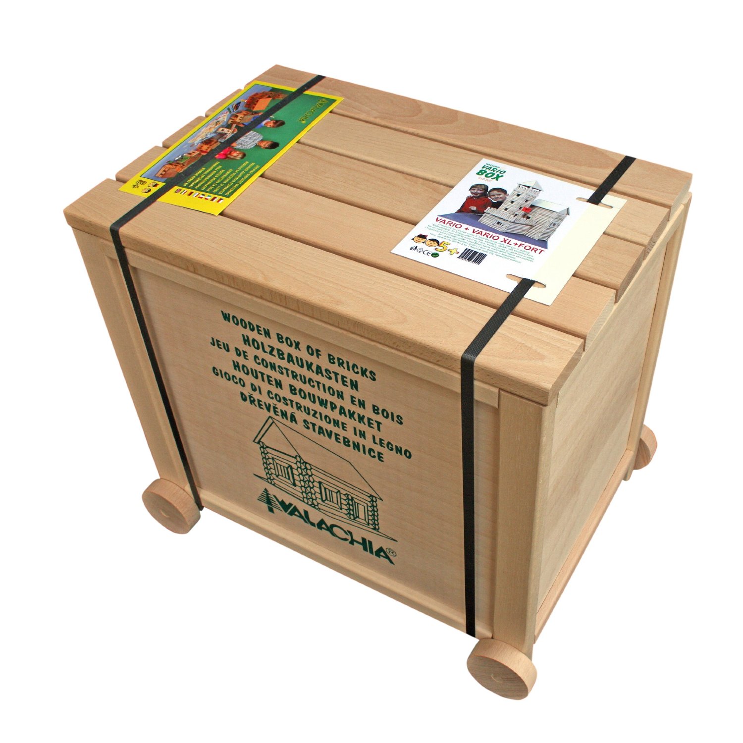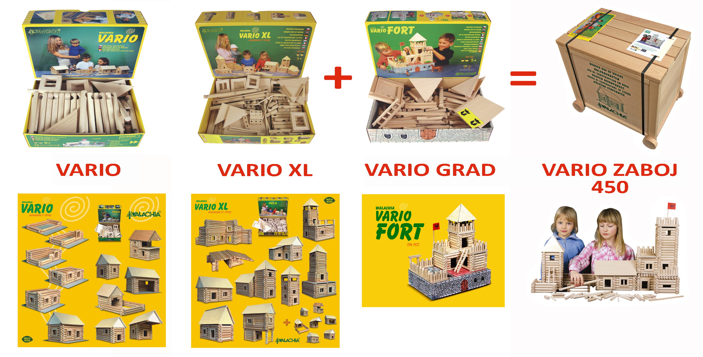 VARIO ZABOJ 450 vsebuje vse, kar vsebujejo kompleti VARIO, VARIO XL in VARIO GRAD. Iz 450 lesenih delov, ki so skranjeni v kakovostni leseni škatli, je mogoče sestaviti najmanj 24 vrst različnih lesenih konstrukcij in veliki grad.