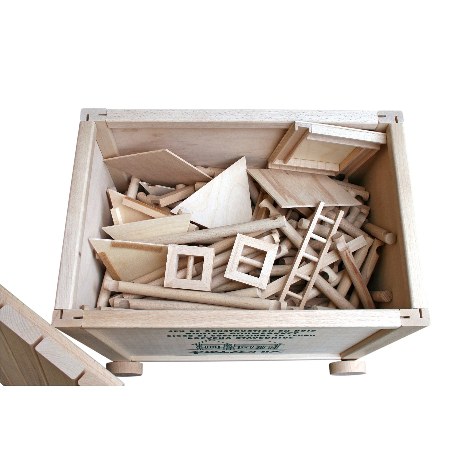 Set vsebuje lesene hlode iz bukovega lesa različnih dolžin, ki v premeru merijo 15 mm. S pomočjo zapornic na koncu vsakega dela se lahko glede na svoje ideje (ali po načrtih, ki so priloženi) sestavljajo različne lesene konstrukcije. Okna in vrata so prav tako iz bukovega lesa.